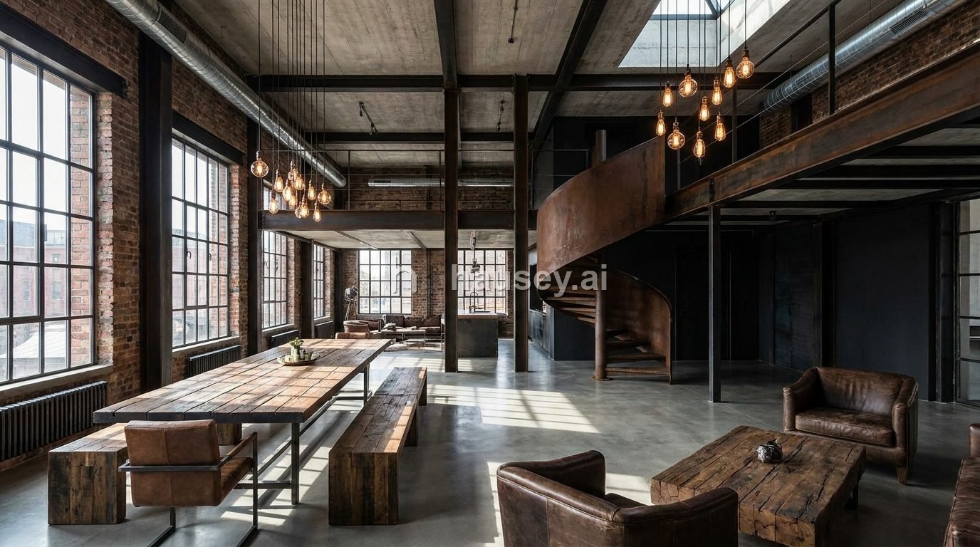 Adaptive-reuse aesthetic built from factories, lofts, and utility surfaces.