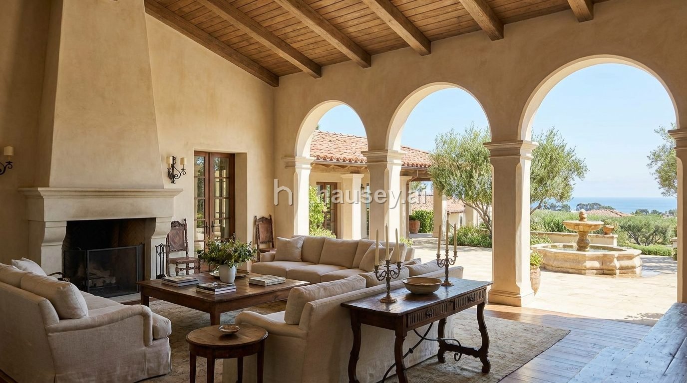The signatures we enforce: Stucco, arches, wrought iron, courtyards, loggias, fountains. Palette stays in the red tile roofs, warm plaster tones. range.