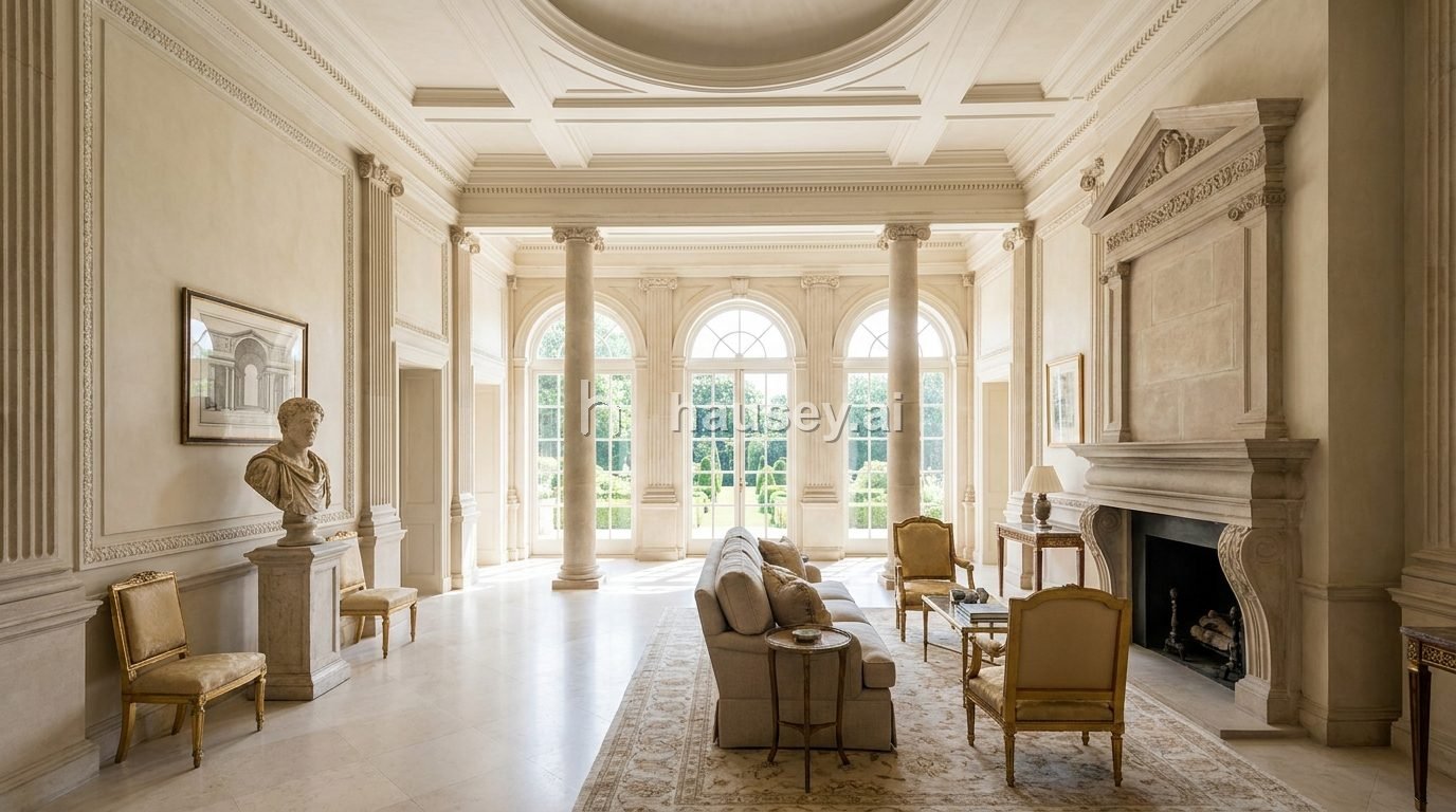 The signatures we enforce: Columns, pediments, blank walls, geometric massing, ceremonial interiors.. Palette stays in the stone/stucco, restrained palettes range.