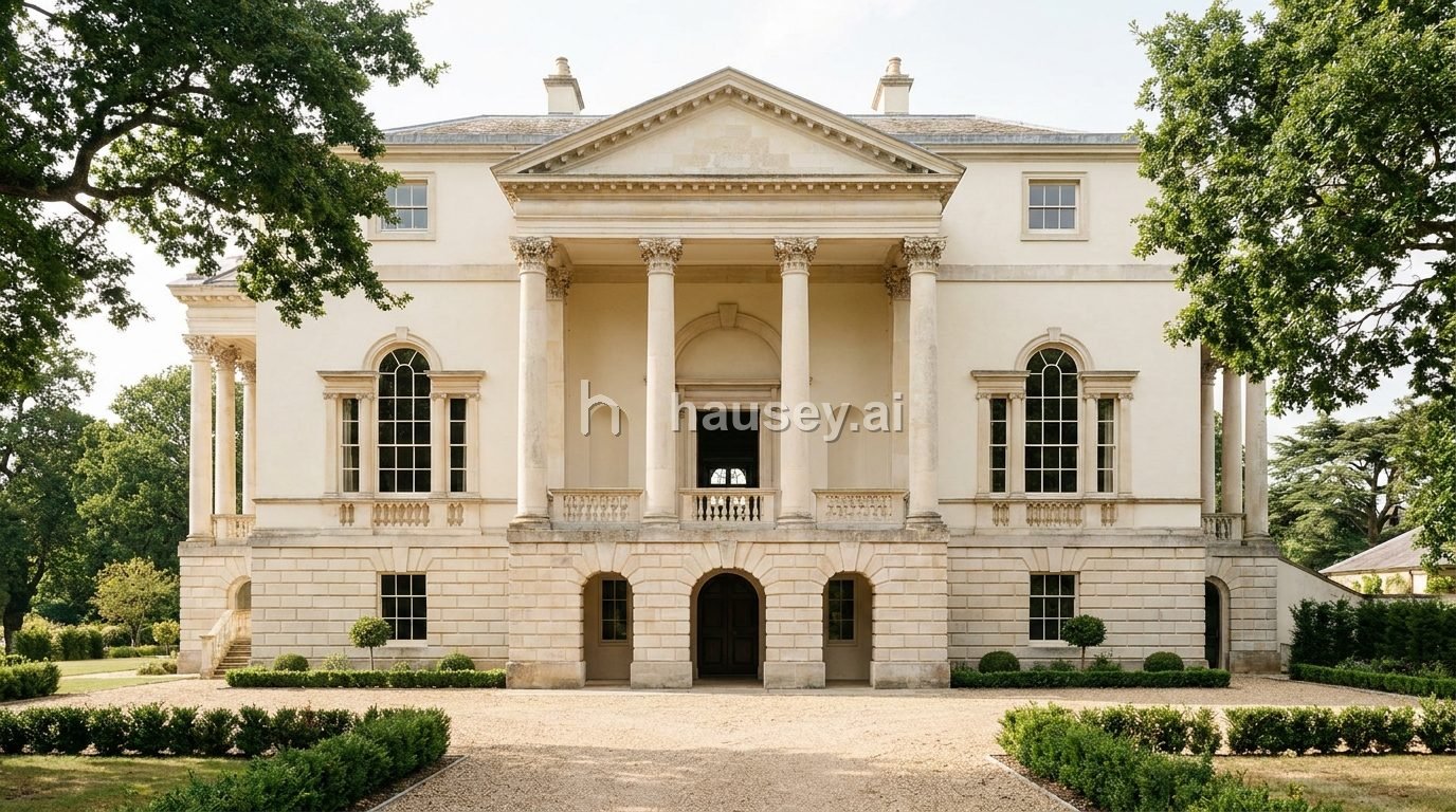 The signatures we enforce: Temple fronts, strict symmetry, piano nobile, Palladian windows, restrained interiors.. Palette stays in the stucco/stone range.