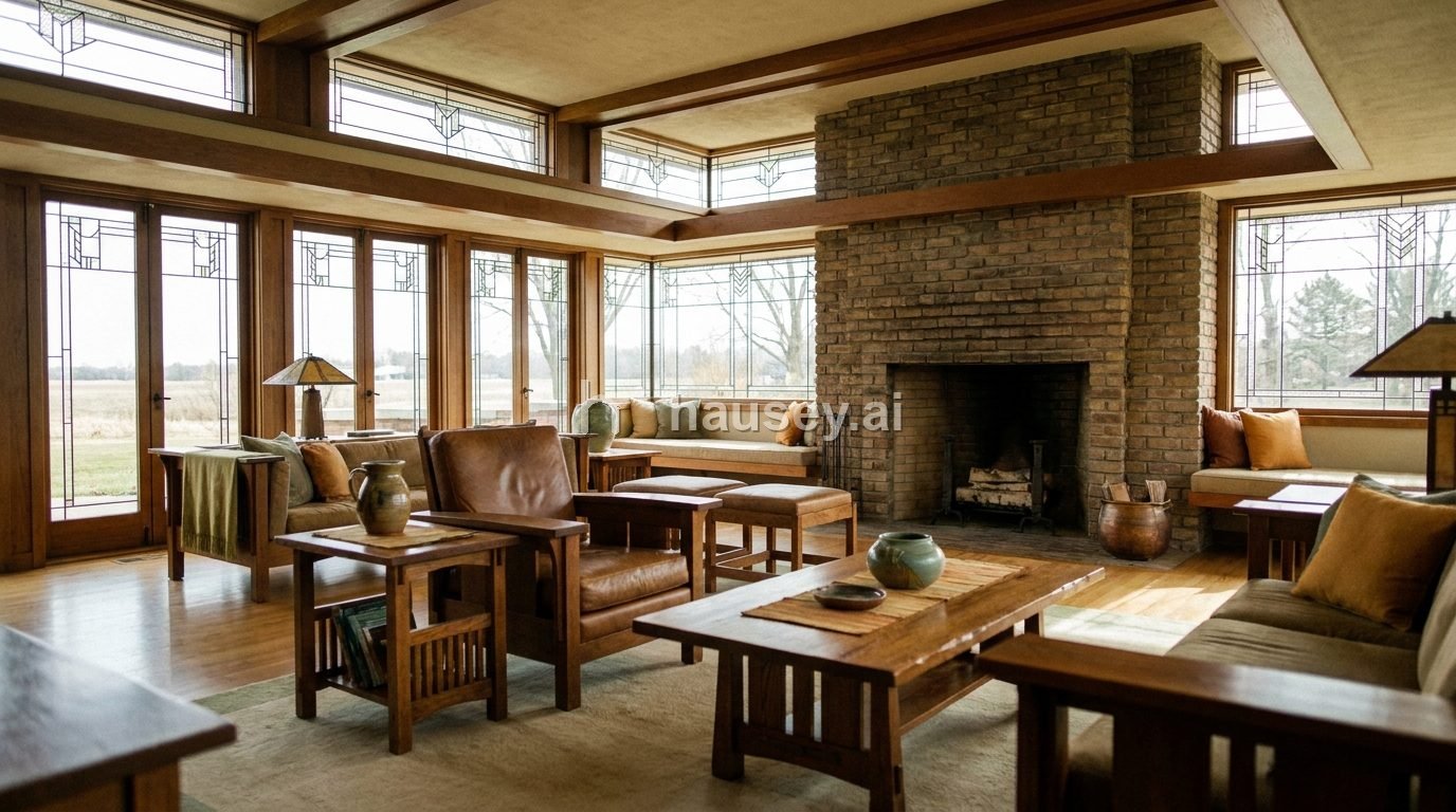 The signatures we enforce: Strong eaves, open plans, ribbon glazing, art glass, brick, stucco, wood. Palette stays in the hearth core, amber/earth tones. range.