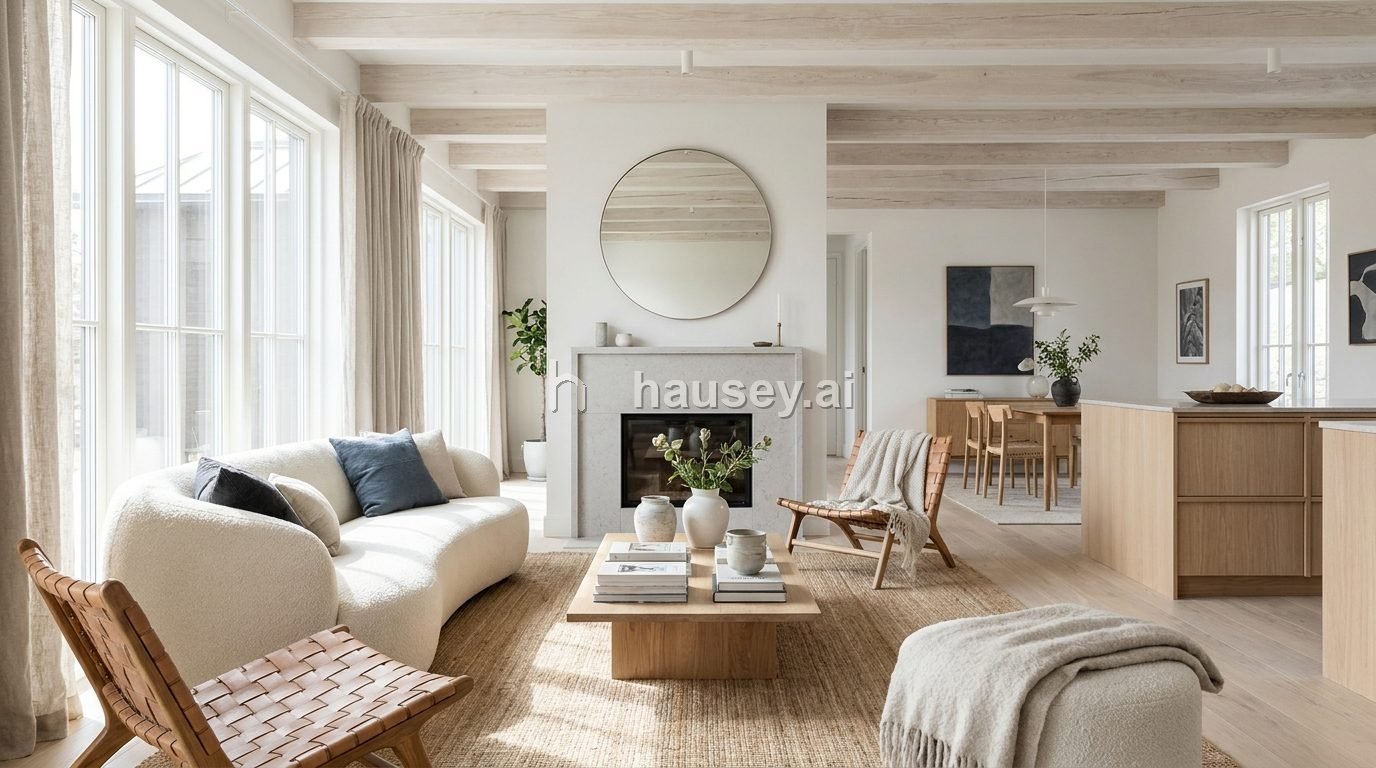 The signatures we enforce: Light woods, simple joinery, wool, linen, leather, functional furniture.. Palette stays in the white/off-white, grey/blue accents range.