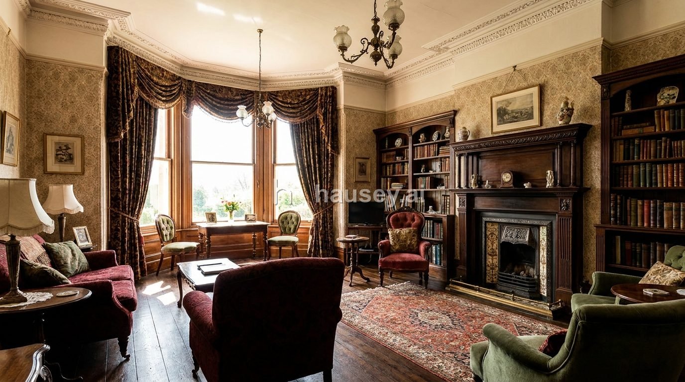 The signatures we enforce: Polychromy, patterned tile, bay windows, decorative wood/iron, wallpaper, fireplaces.. Palette stays in the layered drapery range.
